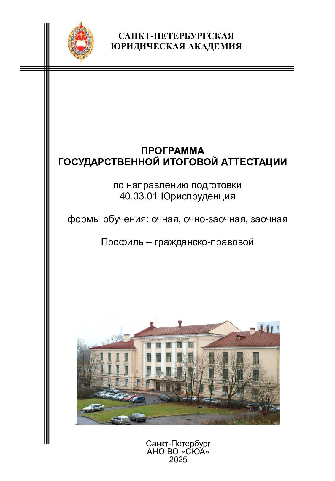 Программа государственной итоговой аттестации по направлению подготовки 40.03.01 Юриспруденция, формы обучения: очная, очно-заочная, заочная. Профиль - гражданско-правовой [Текст] : учебные программы / Санкт-Петербургская юридическая академия, 2025. - 68 с.
