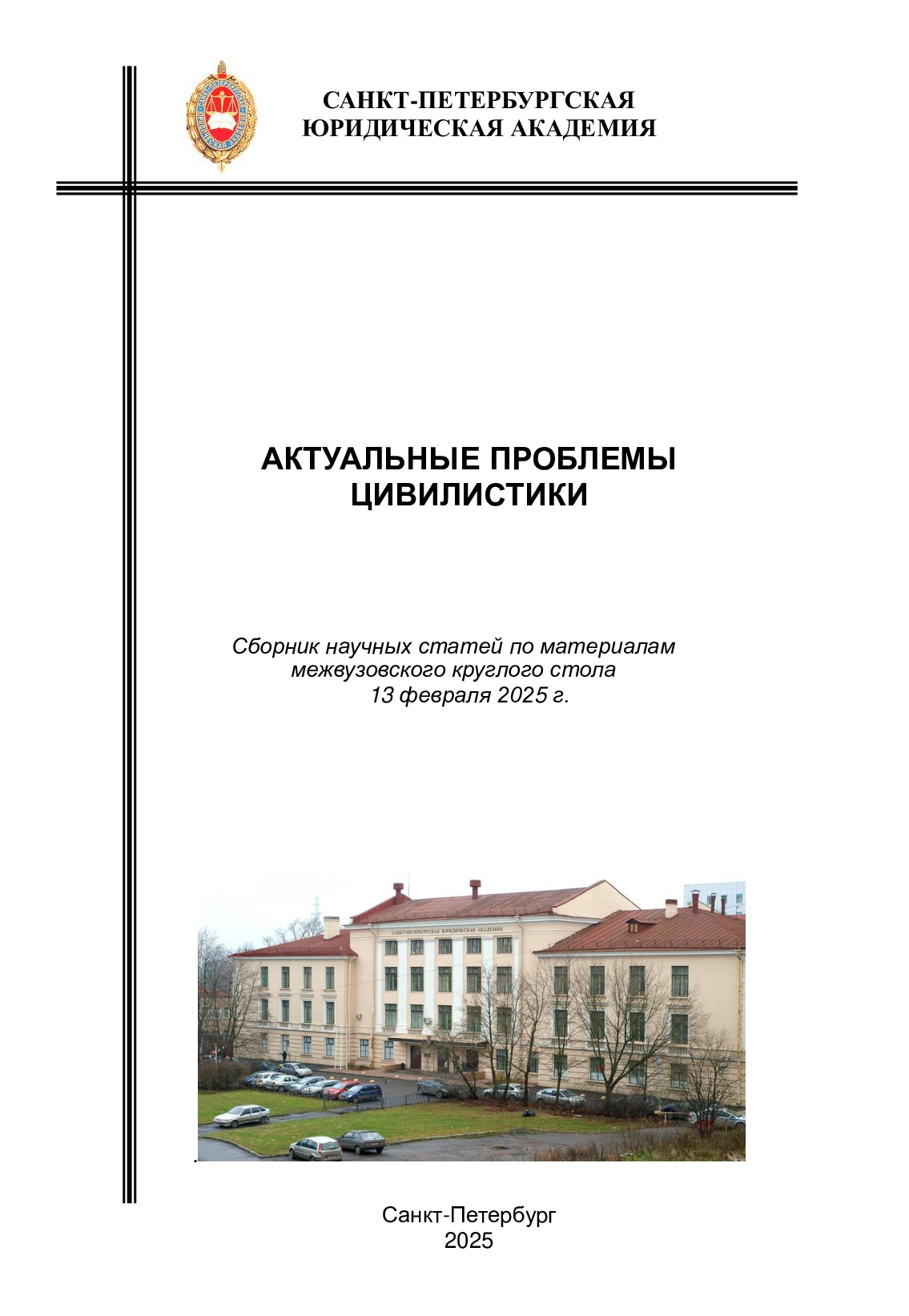 Актуальные проблемы цивилистики [Текст] : Сборник научных статей по материалам межвузовского круглого стола 13 февраля 2025 г. : научное издание / Санкт-Петербургская юридическая академия, 2025. - 184 с.